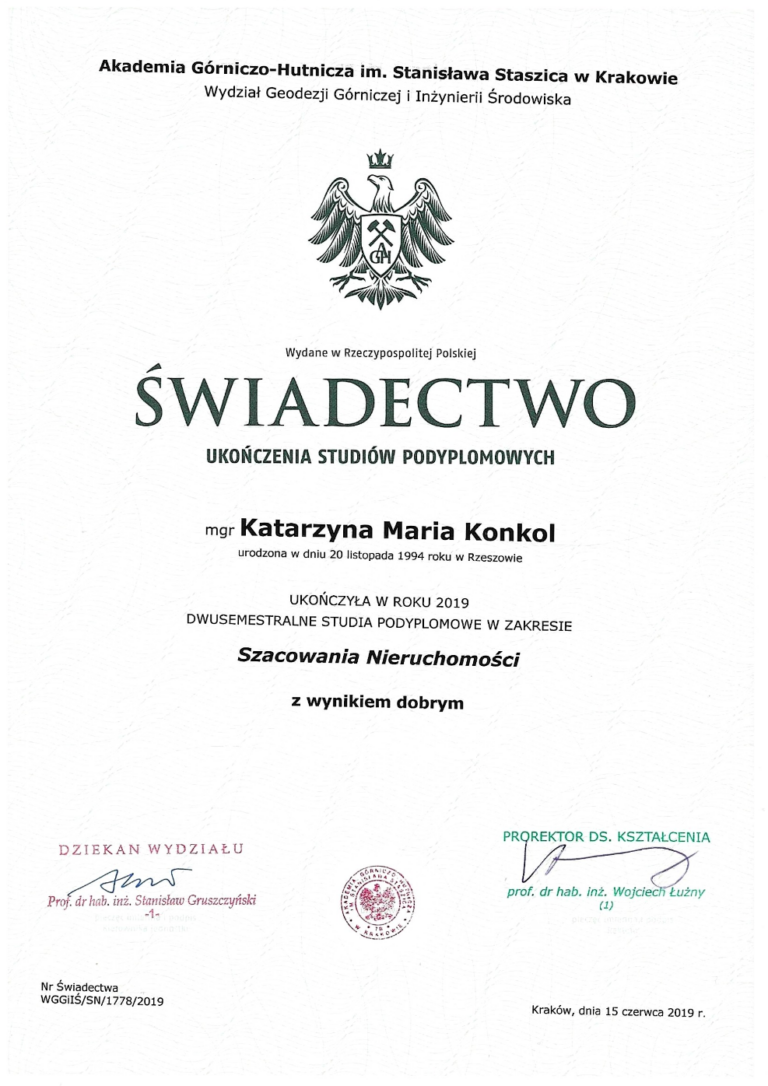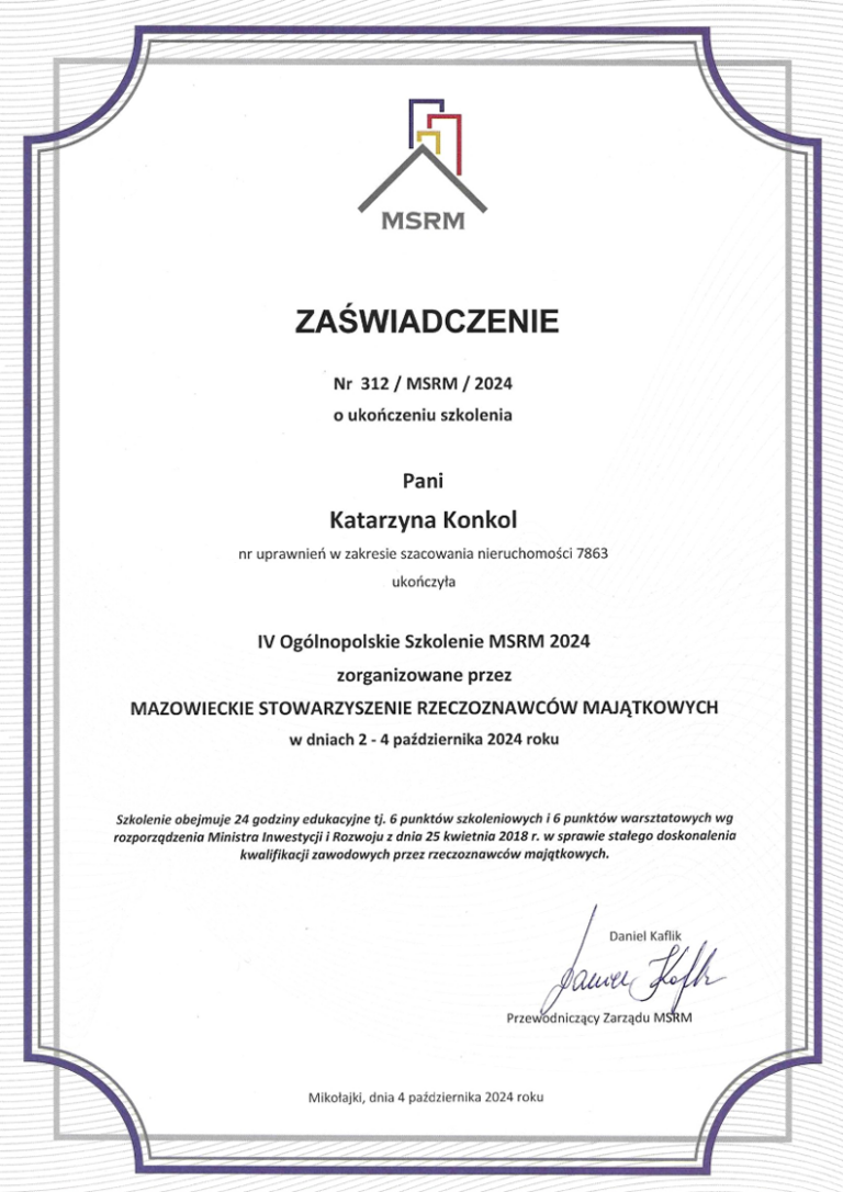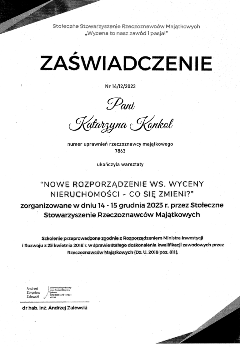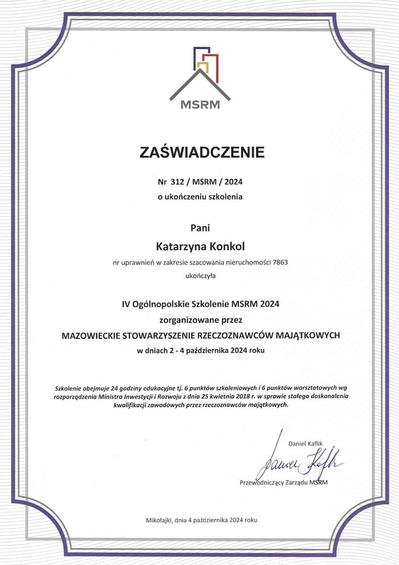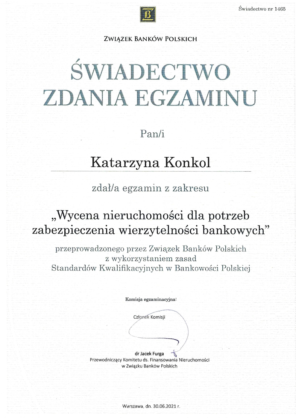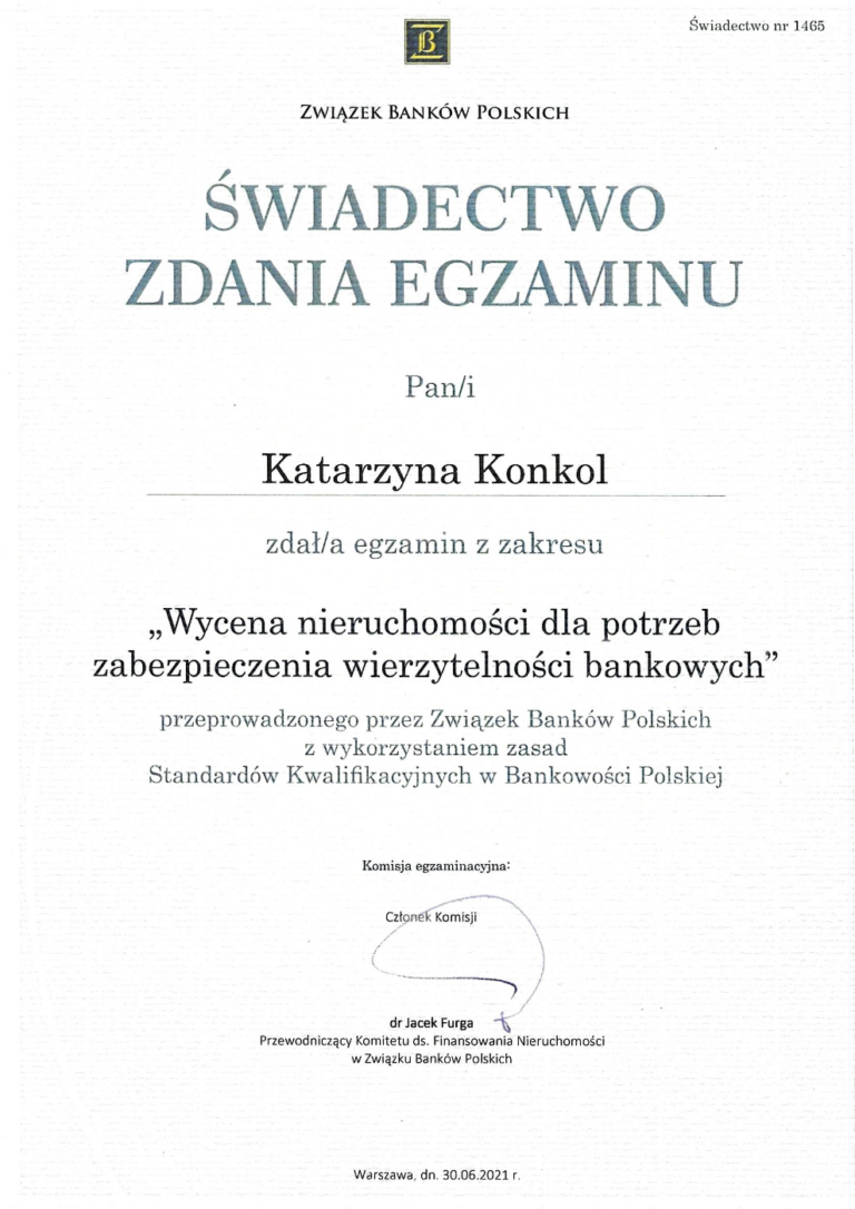 ▸ Członek Podkarpackiego Stowarzyszenia Rzeczoznawców Majątkowych ▸ Posiadam egzamin w Związku Banków Polskich ▸Widnieje na listach rzeczoznawców zalecanych do wyceny dla banków ▸ Biegły sądowy z zakresu szacowania nieruchomości przy Sądzie Okręgowym w Rzeszowie ▸ Członek Warszawskiego Stowarzyszenia Rzeczoznawców Majątkowych